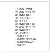 En cualquier caso, los lenguajes de pro-gramación de robots incorporan princi-palmente instrucciones que permiten indi-car los movimientos a realizar, el control del elemento terminal y la comunicación y sincronización con el entorno. La figura 9 muestra un pequeño programa en MELFA BASIC IV, el lenguaje de pro-gramación de los robots de MITSUBIHI, el cual implementa un simple movimiento de producto (pick and place). La estructura del programa es muy simple y las ins-trucciones utilizadas son de movimiento sin restricciones (MOV) y movimiento lineal (MVS), para apertura y cierre de la pinza (HOPEN y HCLOSE) y de retardo (DLY). PWAIT, PGET y PPUT representan la posición de inicial, la posi-ción de recogida de la pieza y la de suelta, respectivamente.