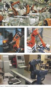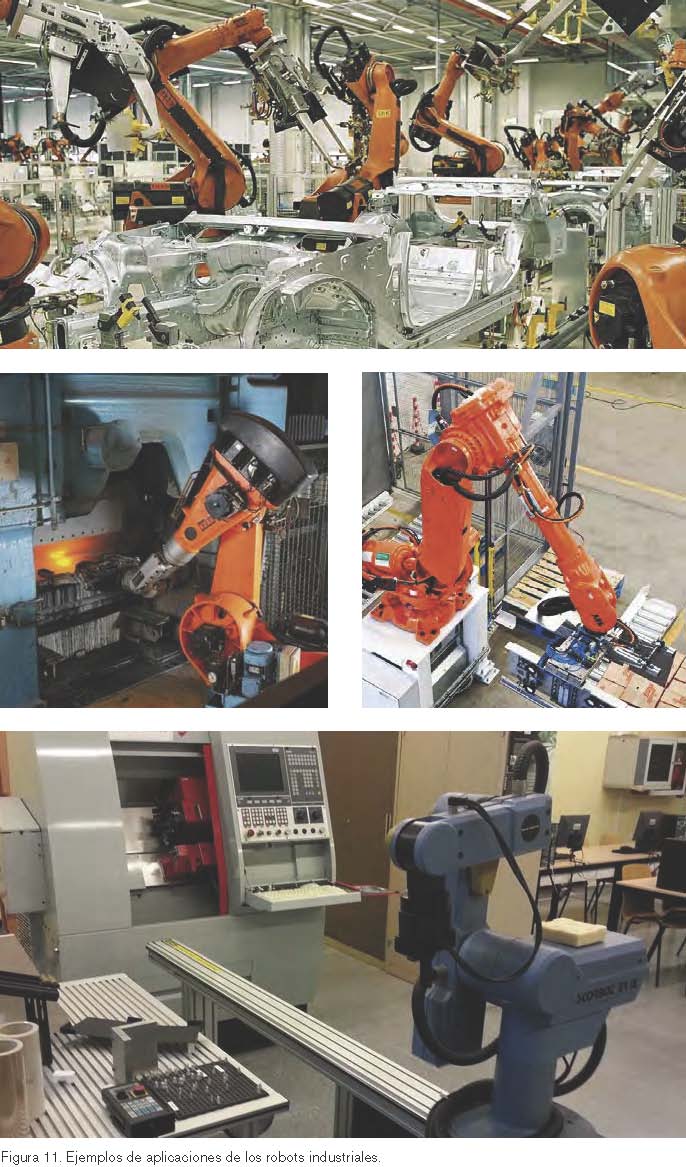 La figura 11 ilustra la actuación de los robots en diferentes aplicaciones, de izquierda a derecha y de arriba hacia abajo: una línea de soldadura de carro-cerías de coches, la descarga de una máquina de fundición, una tarea de pale-tizado y la carga/descarga de una máquina herramienta.