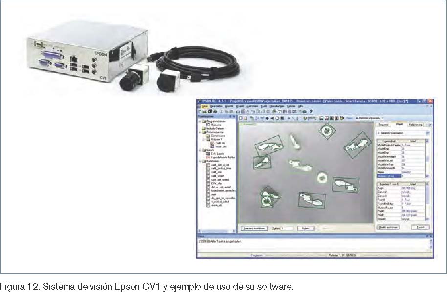 La mayoría de fabricantes de robots comercializan sistemas de visión directa-mente integrables con sus robots, en algu-nos casos basados en el uso de hardware(cámaras y placas de procesamiento) de fabricantes especializados. Ejemplos de software de visión son el PickMaster de ABB y el MotoSight 2D de Yaskawa, ambos basados en el hardware de Cognex. Fanuc, por su parte, comercializa un sis-tema de visión integral propio, el iRVi-sion, al igual que Epson, que comercializa el Epson CV15. La figura 12 muestra una imagen del hardware del sistema Epson CV1 y otra de la aplicación de su software, el Epson Vision Guide, en el reconoci-miento y localización de piezas.