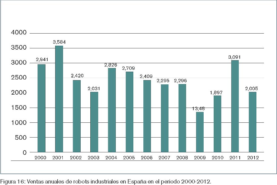En el año 2012 se vendieron en España 2.005 robots industriales, el 35% menos que en 2011, año que por otra parte supuso un record absoluto de ventas. Así, del año 2004 a 2009 hubo un decremento constante de las ventas (figura 16), debido a la caída en el sector de la automoción. Sin embargo, en 2010 hubo un incremento en la inversión en robots en dicho sector, que se reflejó en un incremento en las ventas en ese año y también en 2011, con un crecimiento también en otros sectores. Debe tenerse en cuenta que España es uno de los principales fabricantes de vehículos en Europa y que este sector es el que acapara una buena parte de la demanda de robots.