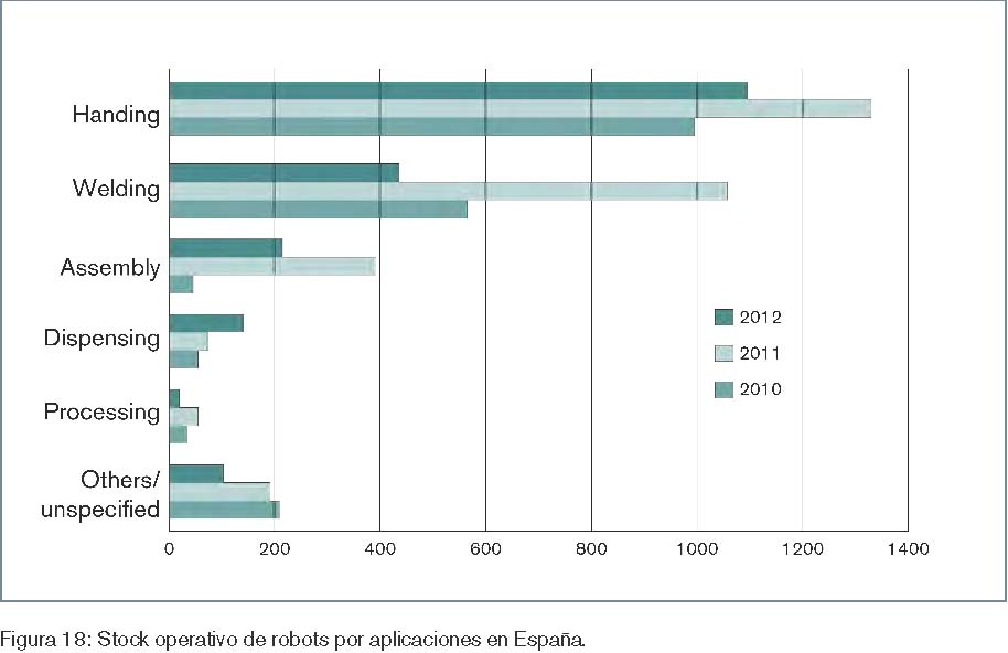Respecto al stock operativo estimado, de los 28.911 robots operativos, 12.416 (43%) son utilizados en aplicaciones de manipulación, 11.536 (40%) en soldadura, 1.353 (5%) en aplicación de materiales, 691 (2%) en procesamiento, 1.520 (5%) en ensamblado/desensamblado, 583 (2%) en otras aplicaciones y 852 (3%) sin uso conocido. Así, en el stock operativo se aprecia mucha menor distancia entre la manipulación y la soldadura, y las aplicaciones son claramente dominantes y con porcentajes similares. La figura 18 recoge los números absolutos del stock de robots operativos, clasificados por aplicaciones, correspondientes al final de los años 2011 y 2012.