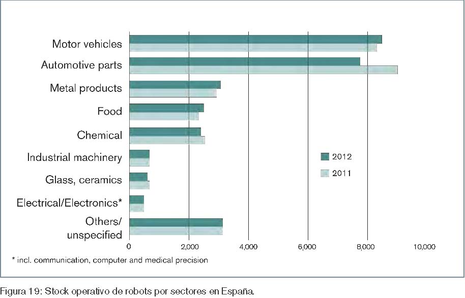 Si se tiene en cuenta el stock operativo en lugar de las ventas en un solo año se obtienen números relativos similares: automoción, 16.035 robots (56% del total); alimentación, 2.473 robots (9%); metal, 3.999 robots (14%); productos plásticos y químicos, 2404 robots (8%). La diferencia más relevante corresponde al sector de la alimentación, en el que un porcentaje de ventas en 2012 mayor que el porcentaje que recoge el stock operativo (13% frente al 9%) indica una tendencia de incremento de uso de robots en dicho sector. La figura 19 recoge los números absolutos del stock de robots operativos, clasificados por sectores, correspondientes al final de los años 2011 y 2012.