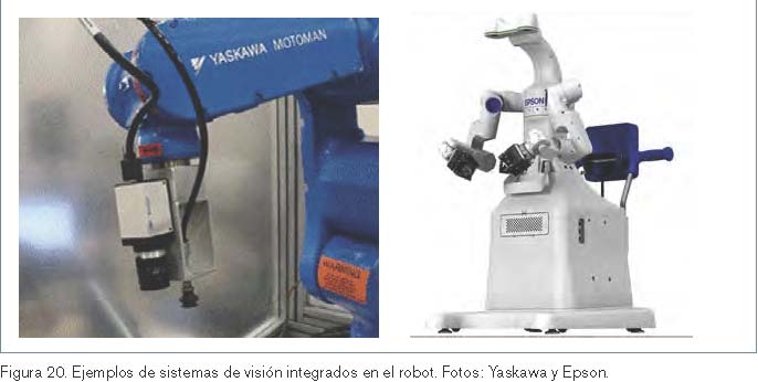 Respecto a los sistemas de visión, la tendencia es la de ubicar la cámara no en una posición fija como se ha estado realizando hasta el momento, sino sobre el propio robot. Así, muchos fabricantes ya tienen en cuenta la ubicación de la cámara en el propio elemento terminal (algo que la tecnología de años atrás no permitía por la dificultad de adquirir imágenes de calidad con una cámara sujeta a rápidos movimientos), lo que incrementa la precisión en tareas de manipulación, de atención de máquina y de ensamblado. Por otra parte, en el caso de robots como los dual-arm, que se asemejan al cuerpo humano, la cámara (o cámaras) puede integrarse en la ubicación que correspondería a la cabeza. La figura 20 recoge una foto de un robot de Yaskawa13 con una cámara ubicada en su extremo, a la izquierda, y una de un prototipo de robot dual-arm de Epson4 que integra dos cámaras (visión estereoscópica) a modo de ojos, a la derecha.