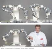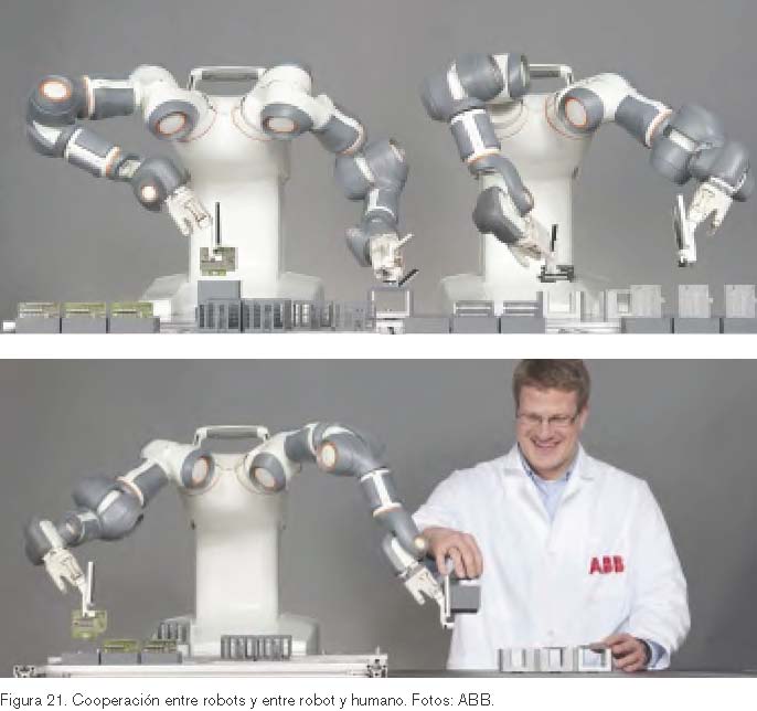 Actualmente se trabaja en el desarrollo de sistemas multirrobot que cooperen en el entorno productivo, lo cual puede suponer modificaciones en el layout y los sistemas de transporte de las instalaciones. Más allá se consideran escenarios en los que robots y trabajadores humanos cooperen entre sí en diferentes tareas y puntos del proceso productivo, lo que supone un reto desde el punto de la seguridad, ya que humanos y robots compartirán un mismo espacio de trabajo con los riesgos que esto comporta. En la actualidad, la normativa obliga a que los robots trabajen en espacios aislados sin acceso humano, pero en un futuro próximo se espera que puedan salir de la jaula. La figura 21 muestra dos imágenes de robots dual-armde ABB1 que ilustran el concepto de interacción robot-robot y robot-humano.