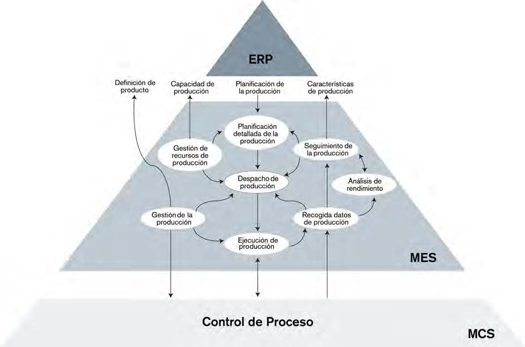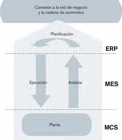 El sistema MES es una herramienta software que funciona como una extensión del sistema ERP, pero orientado a la pla-nificación y ejecución de la producción (Blumenthal, 2004). De este modo, mien-tras el sistema ERP determina qué se va a fabricar, MES concreta cómo se va a fabri-car responsabilizándose de tareas como: la conexión y desconexión de máquinas y equipos, la realización y medición de pie-zas, el movimiento de materiales hacia y desde las estaciones de trabajo, el cambio de prioridad en las órdenes de trabajo, el ajuste y la lectura de los parámetros de calidad, la asignación y reasignación de personal, la asignación y reasignación de materiales, la programación y reprogra-mación de equipos y máquinas, la conse-cución de un producto con las prestacio-nes y características deseadas, etc.