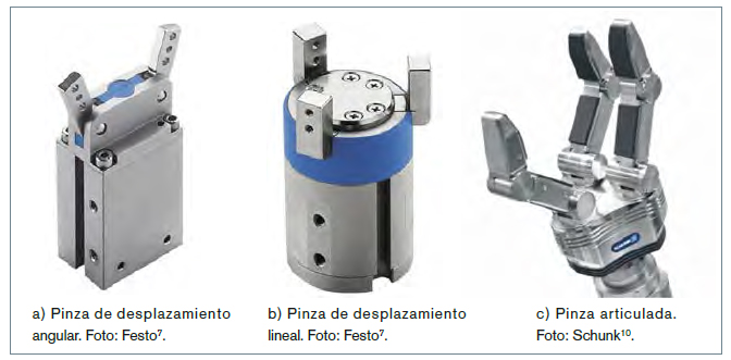 Entre los elementos terminales se diferencian dos grandes grupos, los ele-mentos terminales orientados a la mani-pulación y las herramientas de uso espe-cífico. Las conocidas como pinzas permiten la aprehensión y manipulación de objetos de volumen y tamaño limi-tado. Pueden verse como versiones sim-ples de la mano humana, con dos o tres dedos rígidos con desplazamiento lineal o angular. Las basadas en actuación eléc-trica pueden presentar configuraciones mecánicas más complejas y por tanto más versátiles, aunque en la mayoría de aplicaciones esto no es necesario y resulta más barato y útil una pinza sencilla pero adaptada al objeto particular a manipu-lar. Las pinzas basadas en actuación neu-mática resultan mecánicamente simples, y generalmente más rápidas y baratas, y se utilizan también en un buen número de aplicaciones. Entre los fabricantes de pinzas eléctricas (figura 6) se encuentran Festo7, Schunk10 y Robotiq.