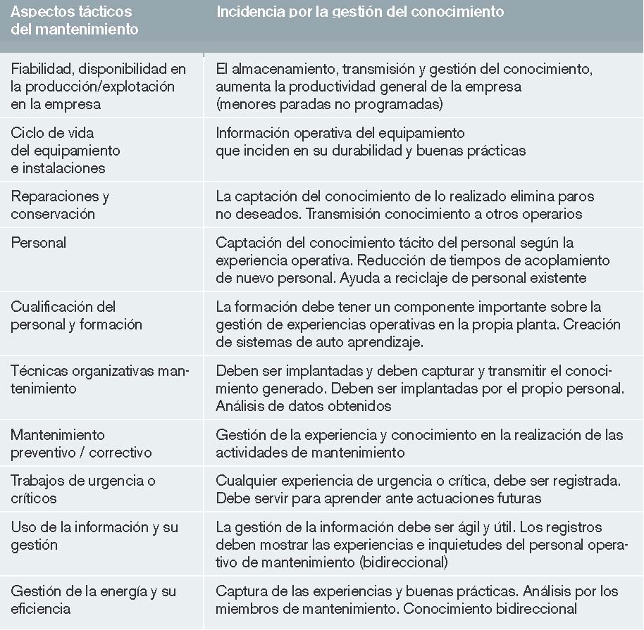 Las técnicas operativas de mantenimiento industrial están ampliamente estudiadas desde el punto de vista de los sistemas, equipos o maquinaria intervinientes en la operatividad del proceso o servicio que debe prestar dicha empresa con alto componente de instalaciones. Se han visto con gran puntualización los procesos de fallo de los elementos tangibles, con el fin de reducir la tasa de fallo de dichos elementos técnicos. Sin embargo, existe un elemento, muchas veces olvidado, otras veces obviado, que, una vez analizado, se convierte en uno de los elementos más influyentes en la mejora operativa y reducción del tiempo de reposición o actuación ante el fallo en las acciones tácticas del mantenimiento industrial: el conocimiento tácito.