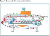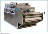 Los filtros banda (figura 8) consisten en una banda continua de tela filtrante que pasa a través de unos rodillos giratorios. El fango acondicionado con un ayudante de floculación, como los polielectrolitos u otros equivalentes, se vierte de forma continua sobre la banda. Posteriormente, al pasar entre los rodillos, es comprimida y una placa rascadora va separando el fango deshidratado de la banda. En estos filtros se consiguen concentraciones del orden del 20% en materia seca.
