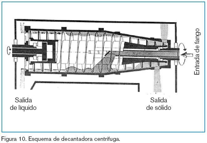 La centrífuga puede trabajar en continuo, siendo igualmente muy impor tante el empleo de un agente floculante o polielectrolito adecuado, a la entrada del rotor, para una mejor separación. En la deshidratación de estos fangos en las centrífugas, se pueden obtener unos lodos con una concentración en materia seca próxima al 20%.