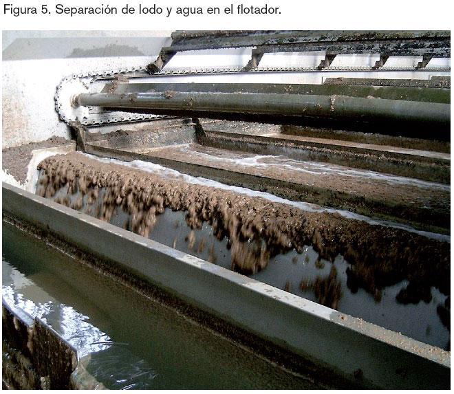 El espesamiento de fangos por flotación es un proceso en el cual los fangos purgados de los decantadoresconcentradores son mezclados con un caudal de agua presurizada y saturada de aire. Este caudal combinado entra en el tanque de flotación a baja velocidad a través de una conducción de mezcla (flotador) que desemboca en un compartimento de entrada por vía de un sistema de distribución. El aire disuelto ya está dosificado antes de que el agua entre a este compartimento. Las partículas pesadas se sedimentan y se recogen en una poceta para purga de fangos, de donde son extraídos. El agua pasará una compuerta rebosadero y entrará en el compartimento de separa-ción, desde donde es enviada a los decantadores-concentradores en cabecera del tratamiento, mientras el fango espesado y flotante es enviado a la siguiente fase de deshidratación