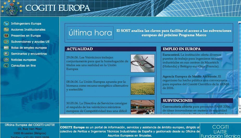 Del mismo modo, la oficina gestiona el portal de Internet www.cogitieuropa.org, donde los profesionales disponen de una amalgama de diversos servicios. Entre ellos, la página se actualiza con una información puntual sobre las cuestiones de ámbito europeo que puedan resultar de interés para la Ingeniería Técnica Industrial española: políticas industriales de la Unión Euro-pea, normativa vigente y propuestas legislativas, debates en el Parlamento Europeo, programas de trabajo de la Comisión Euro-pea, etc.