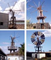 En la primera mitad del siglo XX se produce en las islas Canarias un gran auge de las salinas (figura 6) debido a la aparición de la industria conservera de pescado en la explotación del banco pesquero canario-sahariano, con lo que aparece un nuevo molino de viento denominado salinero canario. Estos molinos de viento captan la energía cinética del viento para transformarla en energía mecánica para bombear el agua del mar procedente de un estancadero para luego elevarla a los cocederos y a los tajos que se encuentran a una altura superior respecto al nivel de mar, donde luego se cristaliza la sal por la evaporización del agua del mar debido a incidencia de la energía solar. En las salinas canarias coexisten varios tipos de molinos de viento (figura 7) y en cada uno se distinguen varios elementos diferenciadores entre sí como es el edificio, la torre, el rotor de aspas y la maquinaria (los sistemas de orientación, los de regulación, los de transmisión y los de bombeo).