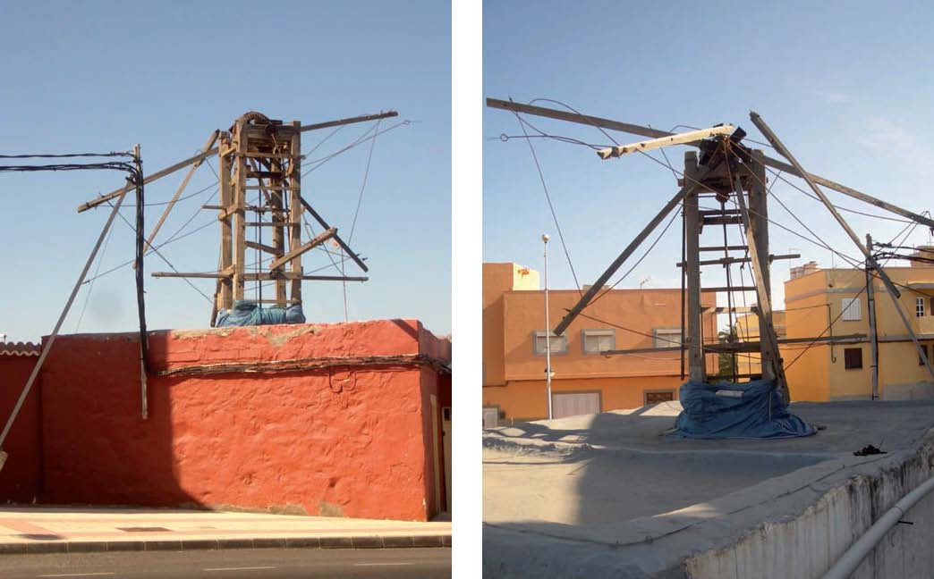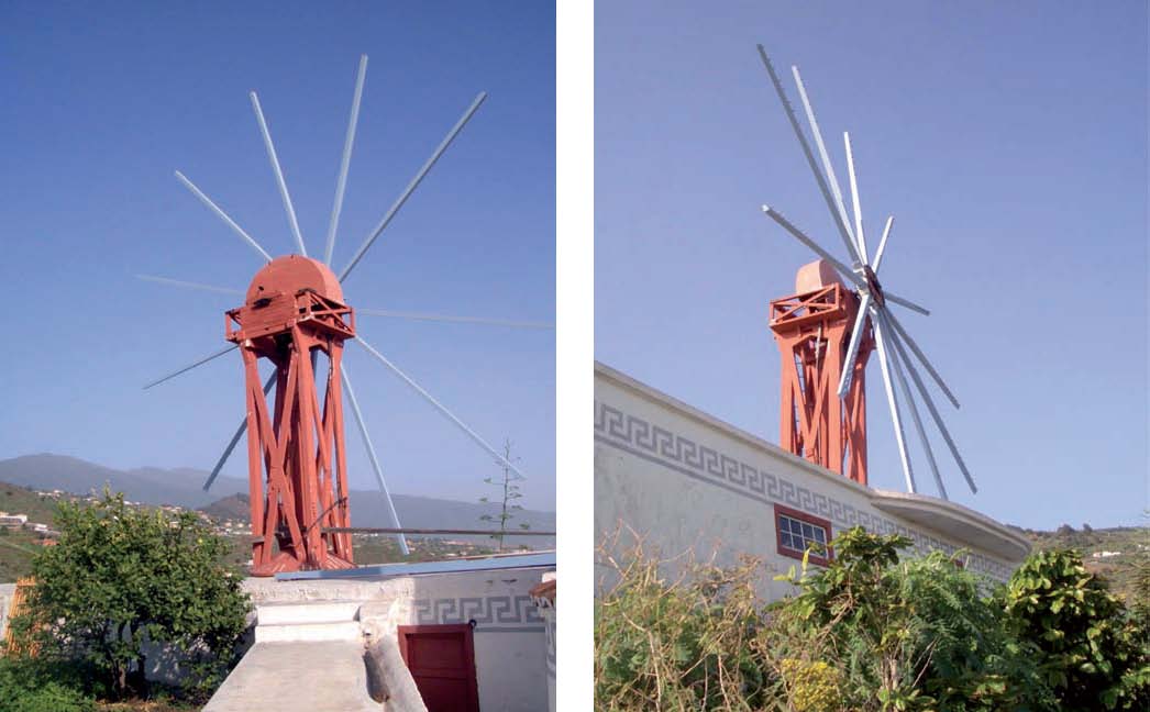 La orientación del rotor de aspas hacia los vientos dominantes se realizaba por medio de un eje o timón de madera que se sitúa en el extremo opuesto del rotor de aspas y que posibilita el giro de 360º de la cubierta cónica y móvil de madera (figura 1). Estos molinos de viento van sufriendo transformaciones continuas en la construcción de los edificios, los roto-res y las maquinarias de molturación ciertamente interesantes al confluir en las islas distintas culturas tecnológicas a lo largo del tiempo.