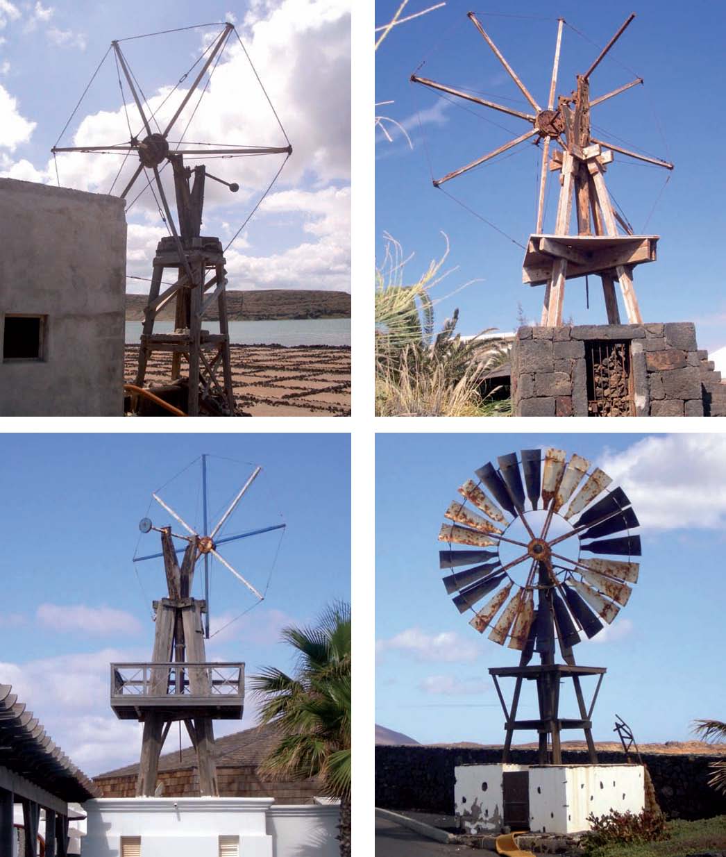 En la primera mitad del siglo XX se produce en las islas Canarias un gran auge de las salinas (figura 6) debido a la aparición de la industria conservera de pescado en la explotación del banco pesquero canario-sahariano, con lo que aparece un nuevo molino de viento denominado salinero canario. Estos molinos de viento captan la energía cinética del viento para transformarla en energía mecánica para bombear el agua del mar procedente de un estancadero para luego elevarla a los cocederos y a los tajos que se encuentran a una altura superior respecto al nivel de mar, donde luego se cristaliza la sal por la evaporización del agua del mar debido a incidencia de la energía solar. En las salinas canarias coexisten varios tipos de molinos de viento (figura 7) y en cada uno se distinguen varios elementos diferenciadores entre sí como es el edificio, la torre, el rotor de aspas y la maquinaria (los sistemas de orientación, los de regulación, los de transmisión y los de bombeo).