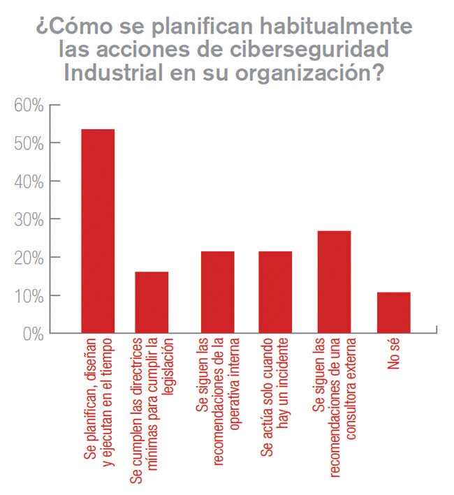 Las empresas grandes y medianas están empezando a tomar conciencia de la situación. Las primeras acciones suelen ser las de concienciación del personal y las evaluaciones del nivel de ciberseguridad, afirma Óscar Navarro, del área de consultoría de S2 Grupo. A pesar de existir un cierto «divorcio» entre los expertos en control industrial y los informáticos de cara a la ciberseguridad industrial, «algunas empresas como la nuestra ya forman equipos multidisciplinares para trabajar en ciberseguridad industrial», añade Navarro.
