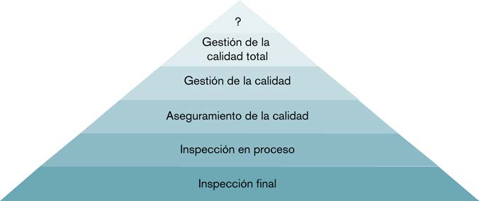 Con el uso de estas normas y la aplicación de herramientas y métodos para la mejora continua de los procesos los sistemas han evolucionado en las formas y en el fondo, con el fin de reducir costes de no calidad y de conseguir la satisfacción de los clientes. En la figura 3 se ilustra esta evolución, que va desde únicamente la inspección del producto terminado hasta la implementación de las técnicas de la gestión de la calidad en todos los departamentos y procesos de la organización.