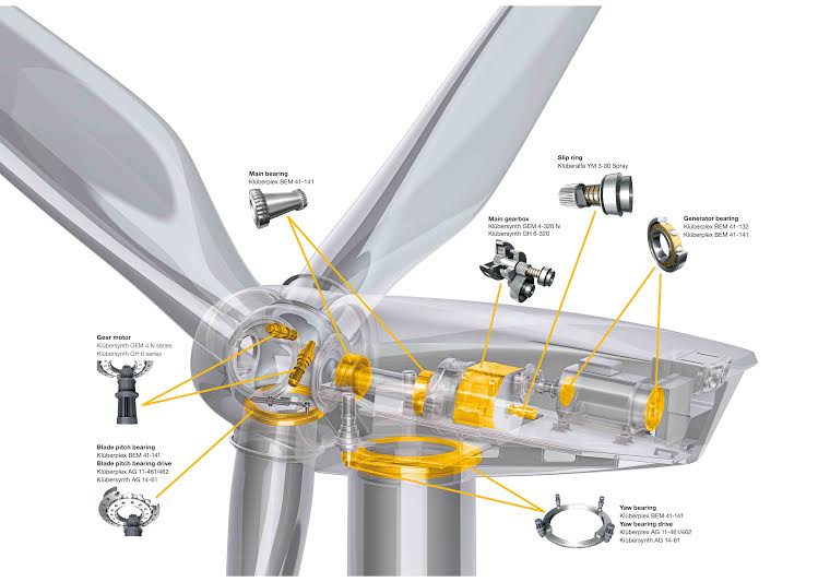 Su formulación en base a los últimos desarrollos en aceites base y aditivos permiten extender o incluso doblar las frecuencias de engrase propuestas por los principales fabricantes de aerogeneradores, manteniendo sus excelentes propiedades a lo largo de toda la vida útil del lubricante. Por otro parte, Klübersynth AG 14-61, es un lubricante blanco adhesivo para engranajes abiertos. Su base sintética asegura una amplia cobertura y fácil aplicación a baja temperatura. Está diseñado para la lubricación de accionamientos piñón/corona, tanto en sistemas de Yaw como de Palas. Puede ser bombeado en equipos de lubricación centralizada hasta temperaturas tan bajas como -30 ºC, permitiendo un funcionamiento en un amplio rango de temperaturas. Las características técnicas de esta grasa incluyen una gran resistencia a la presión y excelentes propiedades además elevada protección contra corrosión en ambientes húmedos. klübersynth AG 14-61 está libre metales pesados, reduce el consumo y mejora la limpieza del entorno del punto de aplicación.