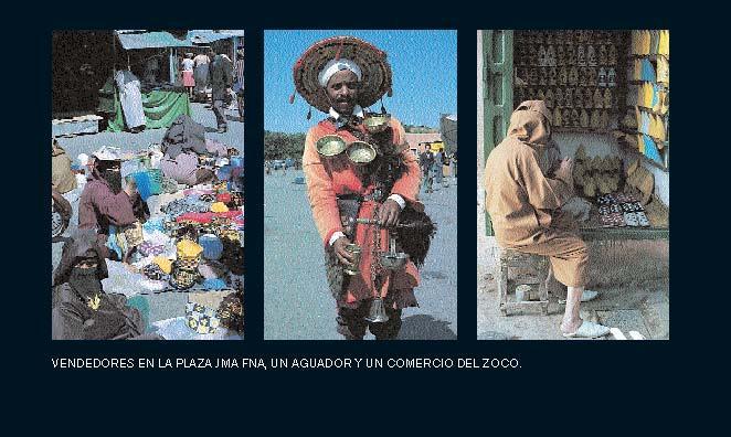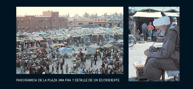 La plaza Jma es el mayor teatro del mundo: última reliquia de aquella Edad Media que tenía el alma ingenua, la alegría fácil, los gustos groseros y violentos. Al declinar el sol comienza la fiesta: sal-tan los acróbatas, danzan los exorcistas Gnaua haciendo sonar sus castañuelas de cobre, suena la flauta hechizada del encantador de serpientes; el brujo desdentado elabora sus filtros de amor con huesos de tiburón y yerbas meadas por una leona blanca, los trileros y los timadores sacan de sus arcas cientos de juegos trucados…