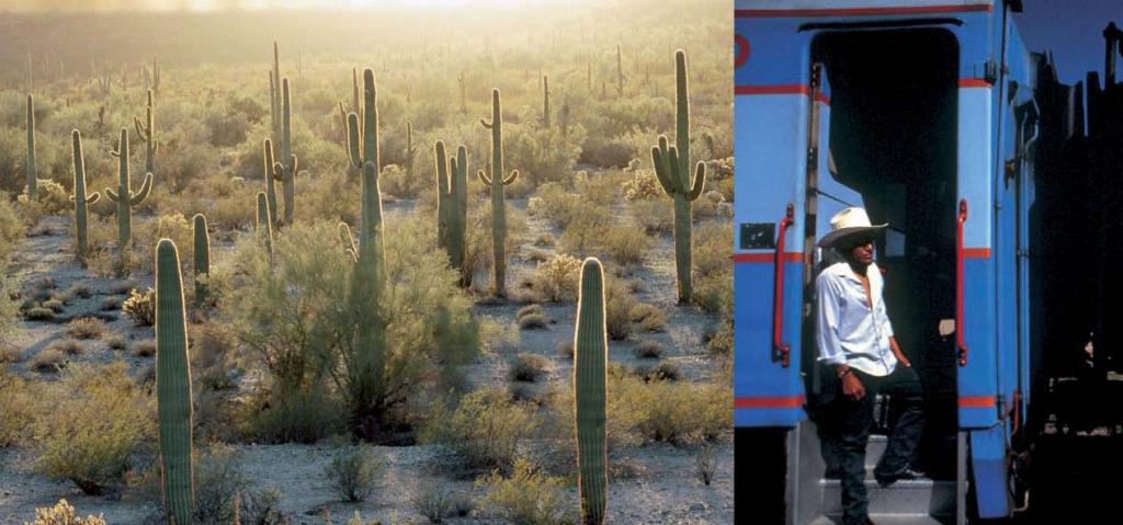 Al amanecer salimos de Los Mochis, atravesando en las primeras luces un paisaje tropical y llano de palmas y cocoteros. Luego, mientras ascendemos en la bruma de la aurora, la tierra se vuelve hosca y severa, como un altar preparado para el sacrificio. Poco a poco, el sol abrasante enciende los candelabros sedientos de los cactus. El tren corre entre desfiladeros, atravesando túneles y escalofriantes puentes de hierro, colgados en el precipicio; cruzando estrechos cañones; ascendiendo entre cascadas que resuenan en las inmensas quebradas como un tambor de guerra. El tren se mueve entre las rocas, haciendo un ruido estrepitoso, como si escapase de esta naturaleza voraz que se lo traga todo.