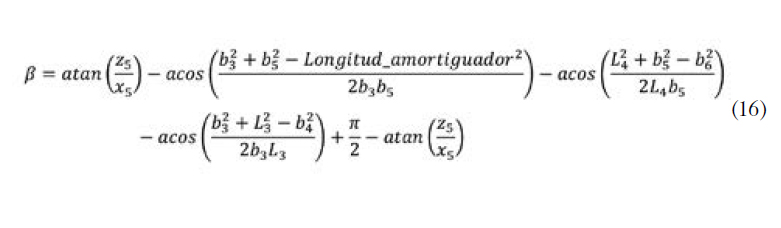 La segunda equivalencia vincula la longitud del amortiguador con el ángulo de la barra L3. Esta equivalencia, requiere el valor de L3, ya que esta medida de la bieleta es determinante en el comportamiento cinemático del mecanismo. Por ello, para la resolución del mecanismo completo, será necesario realizar un proceso de iteración, tal como se explicará en el apartado siguiente. Para este cálculo, se utilizan las siguientes relaciones: