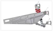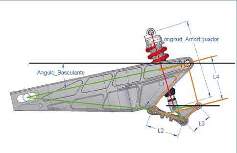 Para regular el comportamiento del sistema de suspensión trasera solo se puede actuar sobre las dimensiones de la bieleta y del balancín. El basculante es un elemento de fabricación compleja: variar sus parámetros supondría un coste económico muy elevado. De igual forma, el amortiguador, al ser un elemento comercial, tiene dimensiones fijas. De ello se concluye que solo se puede actuar sobre las dimensiones de la bieleta y del balancín, elementos de tamaño reducido, gran sencillez y versatilidad de fabricación y reducido coste. En la figura 2 se resaltan la bieleta y el balancín: piezas por determinar.