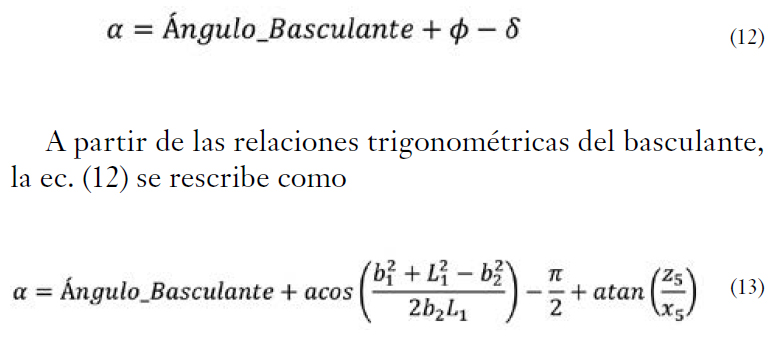 La primera equivalencia que obtener es la que relaciona el ángulo del basculante con el ángulo de la barra L1 (véase la fig. 5). Esta relación se puede deducir como una suma de ángulos,