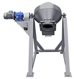 El mezclador está diseñado con dos conos simétricos unidos por una parte cilíndrica central. El eje de giro es perpendicular al eje del cono y pasa a través de la sección cilíndrica. El diseño del mezclador asegura una alta uniformidad de mezclado gracias a su capacidad para mover el producto en múltiples direcciones sin zonas muertas y asegurando la descarga completa del contenido. El rendimiento y la intensidad de mezclado dependen de la velocidad a la que gira la cámara de mezclado.