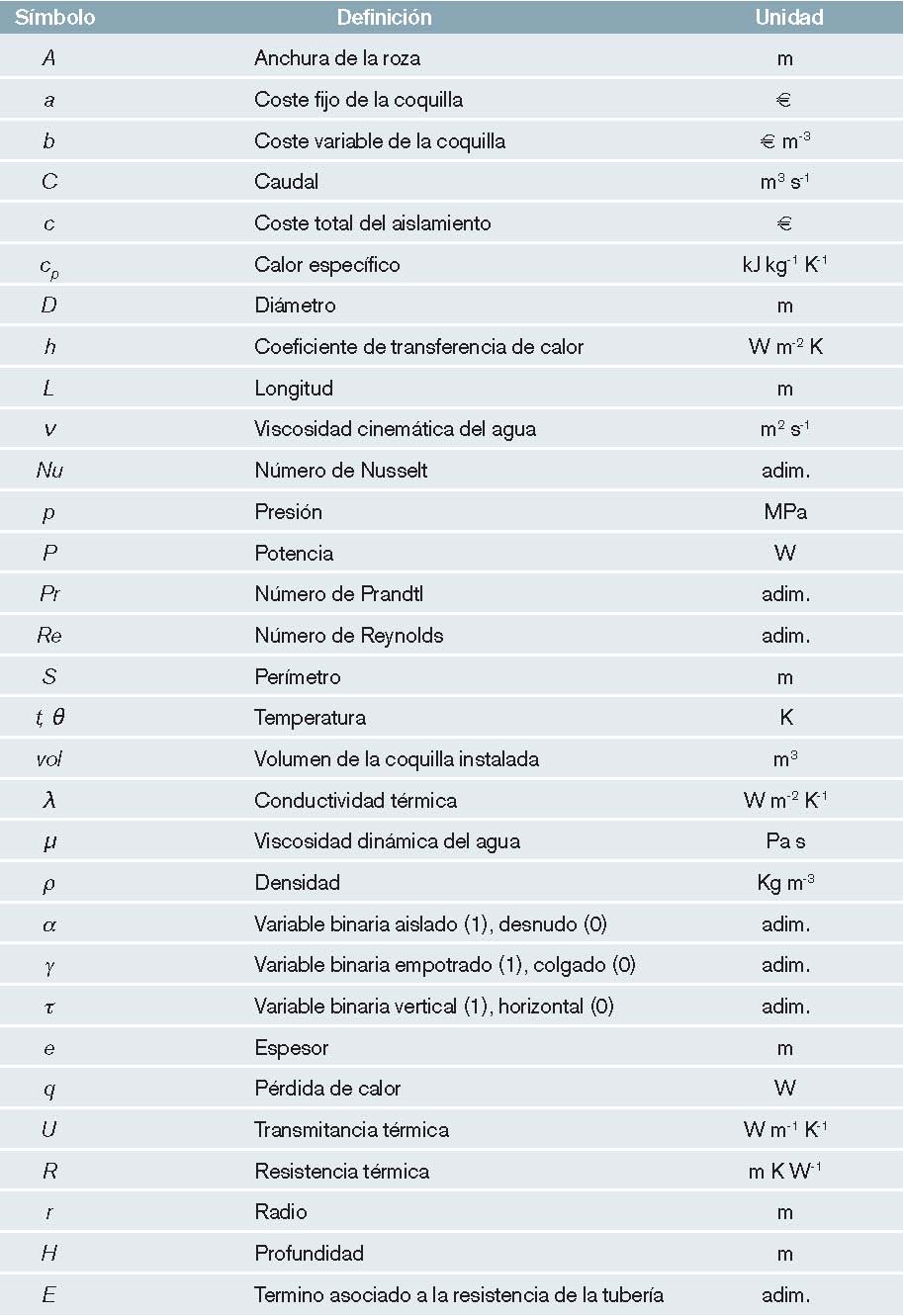 La resistencia del conjunto tuberíacoquilla depende, además de las características de los materiales de la tubería y del aislamiento, de factores de instalación (aislado o no aislado, empotrado o no empotrado) y del espesor del aislante. El valor del parámetro a es 1 si está aislado y 0 si no lo está. El parámetro g indica si el tramo está empotrado en cuyo caso toma un valor 1 o 0 si no está empotrado. La figura 7 muestra algunos de los parámetros más importantes a la hora de desarrollar las expresiones (17)-(20).