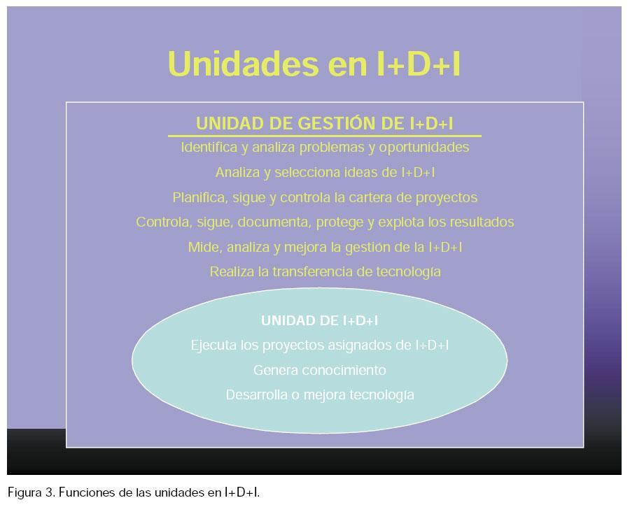 En los sistemas de gestión de I+D+I, la alta dirección debe establecer las unidades de gestión de I+D+I y de I+D+I. La primera sirve para gestionar el sistema de I+D+I y, la segunda, es la encargada de realizar las actividades de I+D+I que le sean encomendadas. En una organización con un sistema de gestión de calidad implantado, y que tenga definido un proceso de diseño y desarrollo, podría ya tener constituidas estas unidades, siendo: