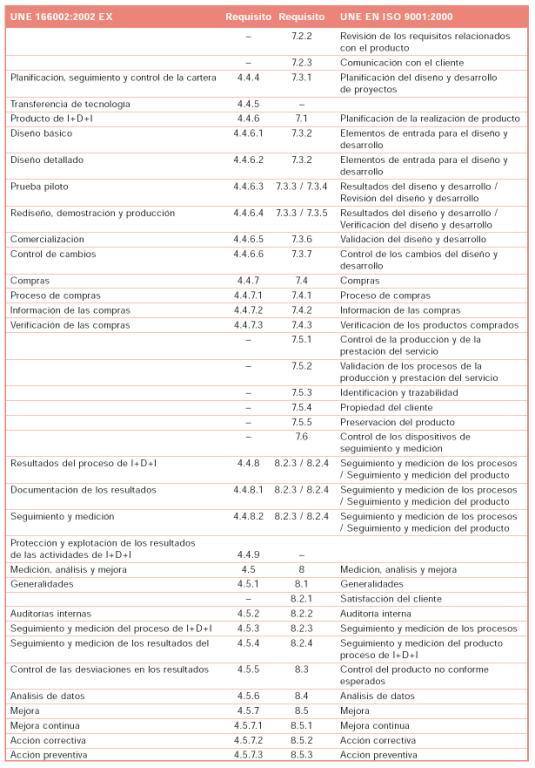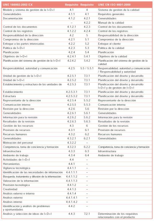 En la tabla 1 se han relacionado los requisitos de la norma UNE 166002:2002 EX con los de la norma UNE-EN ISO 9001:2000 con el objeto de ayudar a la posible integración de los requisitos del sistema de gestión de I+D+I en el sistema de gestión de la calidad: