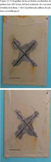 Al extraer las probetas, éstas son sometidas a un proceso de rascado de la pintura para verificar su grado de adherencia, y medir la superficie corroída en la zona en la que ha saltado la pintura. La figura 10 muestra el aspecto de las pro-betas una vez que han sido sometidas al rascado. Como puede observarse, la superficie afectada por la corrosión es menor en la probeta protegida por la pintura aditivada con los blends (figura 10b) que la de la pintura sin aditivar (figura 10a).