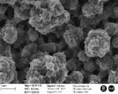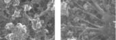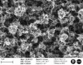 La figura 7a muestra la fotografía, obtenida a 30.000 aumentos con un microscopio electrónico de barrido (SEM), de la superficie de un film de PEDOT puro electrodepositado sobre el electrodo de acero empleando un potencial de 1,400 V durante 300 s, mientras que la figura 7b muestra la fotografía SEM de la superficie de un film compuesto de tres capas de polímeros (multicapa 3). En ambas micrografías se puede apreciar un notable grado de rugosidad de la superficie a escala microscópica.