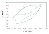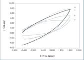 Comparando las curvas de voltamperometría cíclica del PEDOT y del poli-PNMePy solapadas, se puede observar que el primero es, con diferencia, el más electroactivo (figura 5, curva 1). Las áreas de oxidación y reducción son mucho más grandes en el caso del PEDOT (curva 1) que en el caso del poli(NMePy) (curva 2). Los voltamperogramas de control fueron llevados a cabo en un rango de -0,500 V a 1,600 V y a una velocidad de 100 mV s-1.