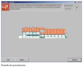 En esta pantalla puede apreciarse la mini Central Hidroeléctrica. Pueden verse el depósito, conducciones, turbina, multiplicador, generador asíncrono y equipo de protecciones y acoplamiento. Así como caudalímetros de aportación de agua Q1, de turbinado Q2, sensor de altura, etc. Existe un botón para ajustar la forma de funcionamiento automática o manual.Se puede ver una indicación textual que nos indicará en modo automático si se ejecuta el algoritmo QÓptimo o QDSM. Existe una variable analógica que nos indicará en % la apertura del distribuidor y otra la potencia de generación en kW.