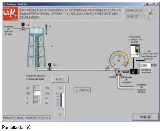 En esta pantalla puede apreciarse la mini Central Hidroeléctrica. Pueden verse el depósito, conducciones, turbina, multiplicador, generador asíncrono y equipo de protecciones y acoplamiento. Así como caudalímetros de aportación de agua Q1, de turbinado Q2, sensor de altura, etc. Existe un botón para ajustar la forma de funcionamiento automática o manual.Se puede ver una indicación textual que nos indicará en modo automático si se ejecuta el algoritmo QÓptimo o QDSM. Existe una variable analógica que nos indicará en % la apertura del distribuidor y otra la potencia de generación en kW.