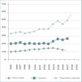 Como podemos apreciar en la figura 1, el número de vehículos en España ronda los 30.000.000, y se ha experimentado en la década 1998-2008 un incremento del orden del 84% en las motos, del 38% en turismos y del 53% en camiones y furgonetas.