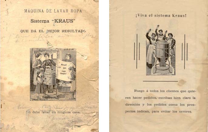 Del mismo modo, como muestra de este esfuerzo vendedor, no debe dejarse pasar la ilustración interior del catálogo de máquinas de lavar Kraus (figura 17), en el que aparece una imagen en la que unas entusiastas usuarias pregonan la bondad del sistema de una forma que hoy parecería ingenua. Resulta obvio destacar que las representadas son, evidentemente, miembros del servicio doméstico, y no las propietarias del producto.