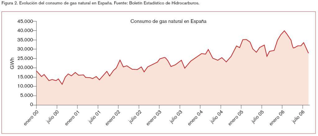 En 2005 se consumieron en España 376.229 GWh de gas natural con una tasa de crecimiento del 18,2% respecto a 2004 (en la Unión Europea no llega al 2%), en que fueron 318.403 GWh, suponiendo un 17,4% del consumo de energía prima-ria en nuestro país. En 1985 esta cifra era únicamente de un 2%, lo que da una idea del crecimiento que ha tenido en España esta fuente energética y su importancia, no sólo desde el punto de vista medioambiental, sino también como factor de competitividad de las empresas españolas. Se espera que ese porcentaje pase en 2010 al 20%, lo que da una idea del aumento del consumo que se prevé.
