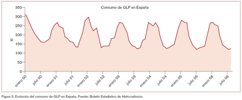 Siguiendo la tónica de comportamiento en dientes de sierra de los años anteriores —2001 negativo, 2002 positivo, 2003 negativo y 2004 positivo—, en 2005 disminuye el consumo global de los GLP ya que no es suficiente el aumento de la demanda del GLP a granel (827.000 toneladas) para compensar el descenso del GLP envasado (1,47 millones de toneladas). Así, el consumo de los GLP disminuye un 2,0%, para un consumo total de 2,29 millones de toneladas que, pese a la fuerte competencia que para este producto supone el gas natural y, en menor medida, la electricidad, sigue siendo una cantidad muy importante en el contexto europeo.