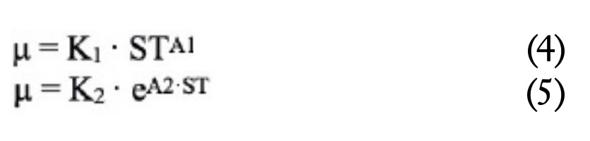 1. ST: aumenta al incrementarse ST. Se han descrito dos tipos de modelos matemáticos para considerar el efecto de ST en la viscosidad según la ecuación (4), modelo potencial y la ecuación (5), exponencial.