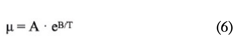 2. Temperatura: disminuye al aumentar la temperatura. Varias fórmulas permiten evaluar la variación de la viscosidad de un fluido al cambiar la temperatura, y la ecuación (6) de Arrhenius es la más utilizada:
