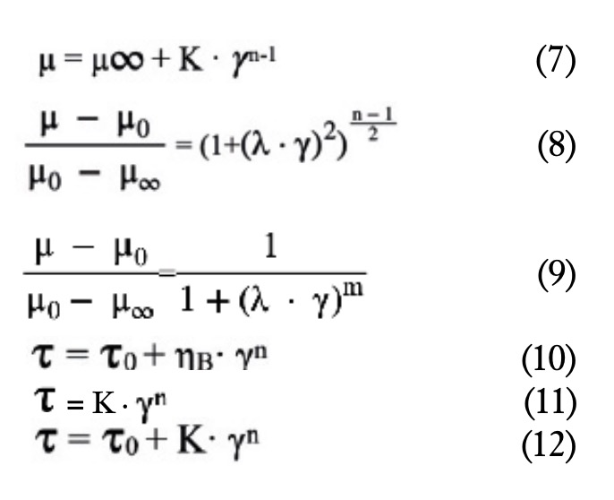 3. Presión: su efecto se ignora en el cálculo de la viscosidad (Panchi Guanoluisa, 2013). Hay varios modelos reológicos de los fluidos NN: ecuación (7), Sisko; ecuación (8), Careau; ecuación (9), Cross; ecuación (10), Bingham; ecuación (11), Ostwald (potencial), y ecuación (12), Herschel-Bulkley.