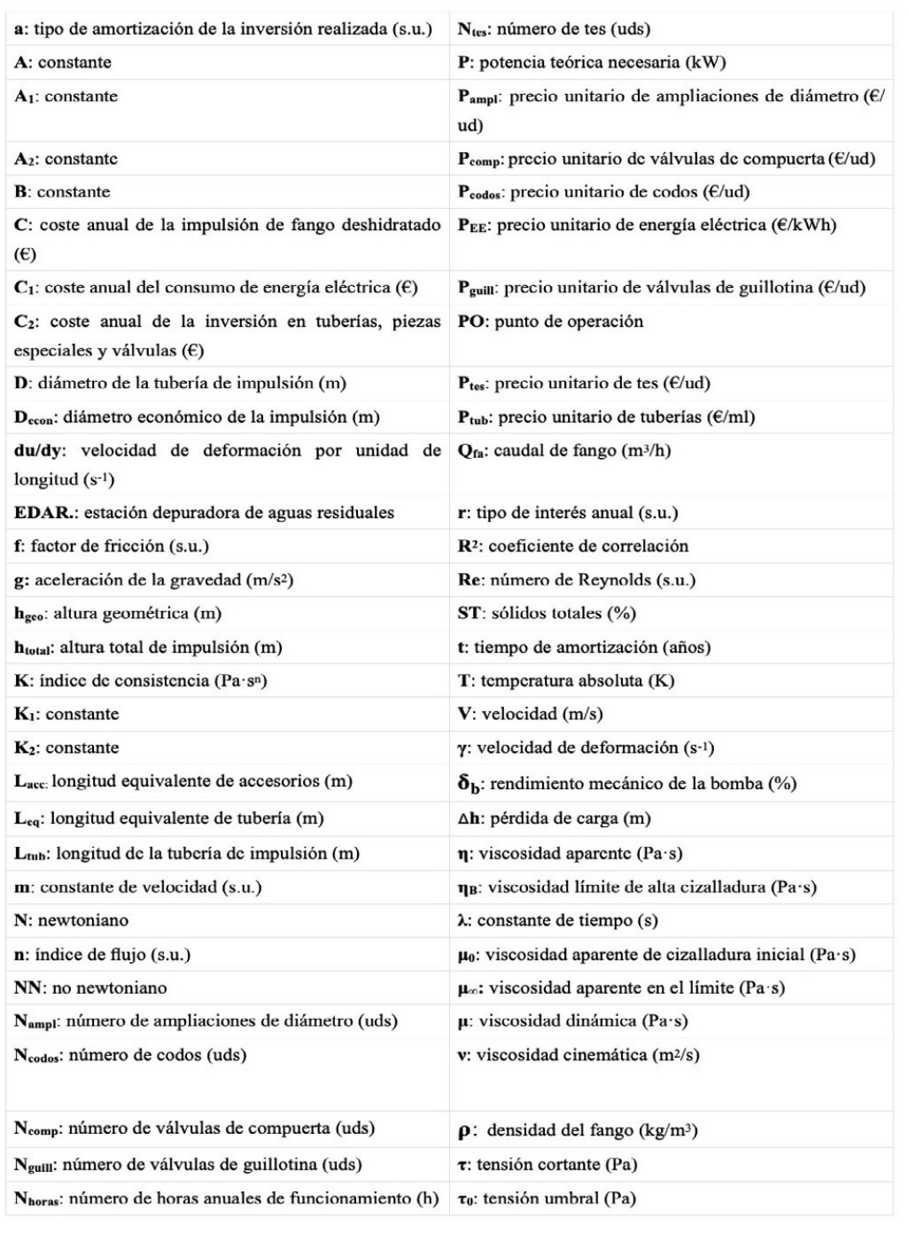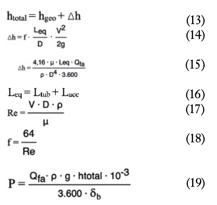 Donde hgeo es la altura geométrica (m); Δh, la pérdida de carga (m); Ltub la longitud de la tubería de impulsión (m); Lacc, la longitud equivalente de los accesorios (m); μ (η), la viscosidad dinámica (Pa.s) del fango; ρ, su densidad (kg/m3); Qfa, su caudal (m3/h); D, el diámetro de la tubería de impulsión (m); V, la velocidad (m/s); g, la aceleración de la gravedad (m/s2), y δb, el rendimiento mecánico de la bomba (%).