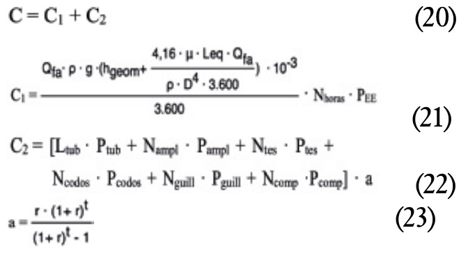 Donde, Nhoras es el número de horas anuales de funcionamiento de la impulsión (h), PEE es el precio unitario del suministro de energía eléctrica (€/kWh), Ptub, Pampl, Ptes, Pcodos, Pguill, Pcomp son los precios unitarios de las tuberías (€/ml), ampliaciones de diámetro, tes, codos, válvulas de guillotina y compuerta (€/ud), Nampl, Ntes, Ncodos, Nguill, Ncomp son el número de unidades de cada pieza especial (uds), r es el tipo de interés anual (s.u.) y t es el número de años de amortización (años).