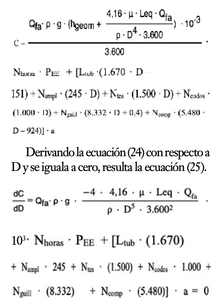 Y si el resultado obtenido es mayor que cero, entonces D hará que el valor de la función C sea mínimo, y se denomina diámetro económico Decon (m) de la impulsión.