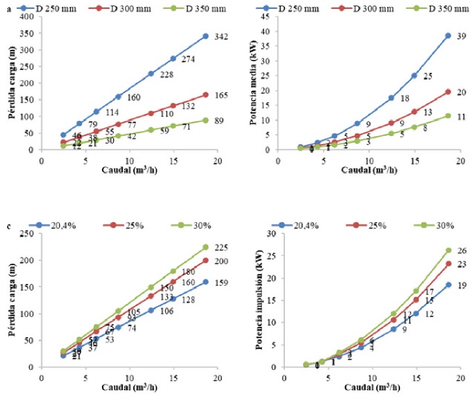 En todos los casos se puede observar la variación lineal de la pérdida de carga con el caudal. Sin embargo, la potencia absorbida varía de forma cuadrática, pues depende de Qfa2. La altura máxima total de bombeo para caudal máximo y ST 30% (ST máximo de las bombas centrífugas) alcanza el valor de 225 m en PO, valor que identifica plenamente la instalación de esta bomba de 24 bares de presión. Destaca la reducción en la pérdida de carga al modificar el diámetro, por ejemplo, de 300-350 mm (incremento D =16,7%), pues disminuye el 46,1% y la potencia absorbida, el 45%. Por otro lado, se observa el gran incremento en la pérdida de carga cuando se disminuye el diámetro a 250 mm, aumentando el 107,3% y la potencia el 95%. Se observa que cuanto mayor es ST, menor es el incremento relativo en la pérdida de carga, pues sigue la curva η= f(ST). El incremento o disminución de la longitud equivalente influye de forma directamente proporcional en la pérdida de carga con iguales incrementos.