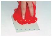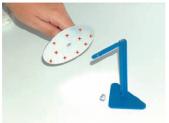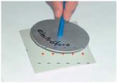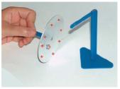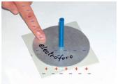 Seguidamente, como queda reflejado en las figuras 3 y 4 respectivamente, acercamos el electróforo a la plaquita de PVC. Éste distribuirá su carga en sus superficies por influencia. A continuación, apoyamos el electróforo sobre el PVC, sujetándolo por el mango aislante. Con el electróforo sobre el PVC, se toca su superficie metálica con el dedo, permitiendo por contacto el paso de la carga eléctrica negativa del disco a nuestro cuerpo y a tierra. De este modo el electróforo quedará cargado positivamente.