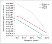 La resistencia superficial de los materiales depende de la humedad relativa de su entorno, apreciación que queda reflejada en el gráfico de la figura 7.