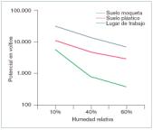 Si se mantiene la cantidad de agua del ambiente constante y se disminuye la tem-peratura, llega un momento en que se alcanza una humedad relativa del 100%. Por el contrario, si en un día de invierno nos encontramos a 0 ºC con un 50% de humedad relativa y pasamos a una habitación donde la temperatura es de 20 ºC, la humedad relativa desciende a un 15% según nomogramas higroscópicos. En estas condiciones de humedad relativa baja, el potencial electrostático que se genere es alto como lo indica la gráfica de la figura 8, produciéndose fenómenos de carga electrostática con elevado voltaje y, como consecuencia, la producción de fenómenos ESD. Por tanto, los fenómenos ESD son más frecuentes en invierno, donde la humedad relativa del aire disminuye como consecuencia de un calentamiento local del aire.