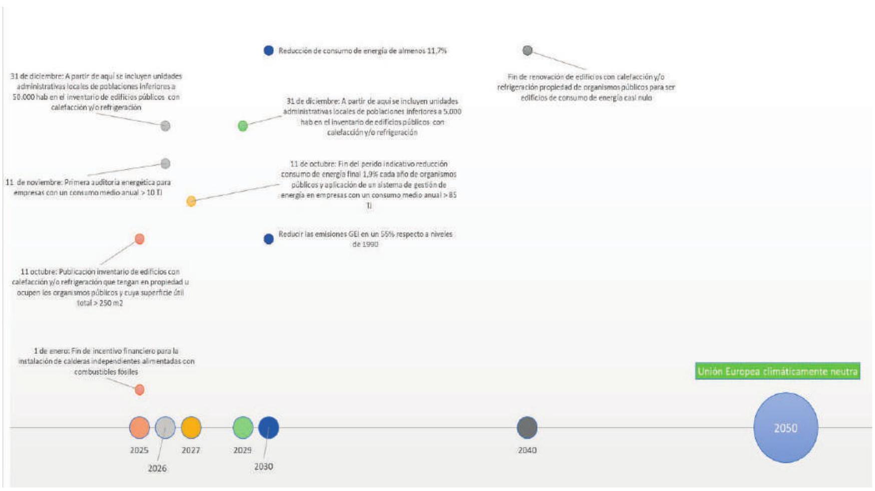 Se establecen varias fechas como hitos intermedios para el objetivo final de 2050, que como se ha mencionado en el resumen, es conseguir una Unión Europea climáticamente neutra. Uno de los hitos más importantes se establece en el año 2030, para ambas directivas, lo cual no significa que pasada esa fecha, como se verá a lo largo de artículo, no se realicen actuaciones o se marquen objetivos.